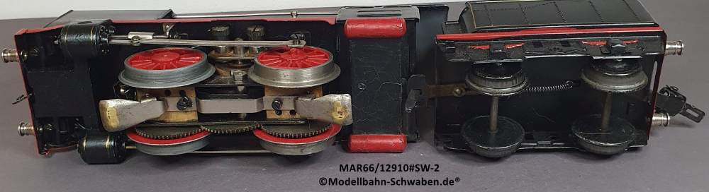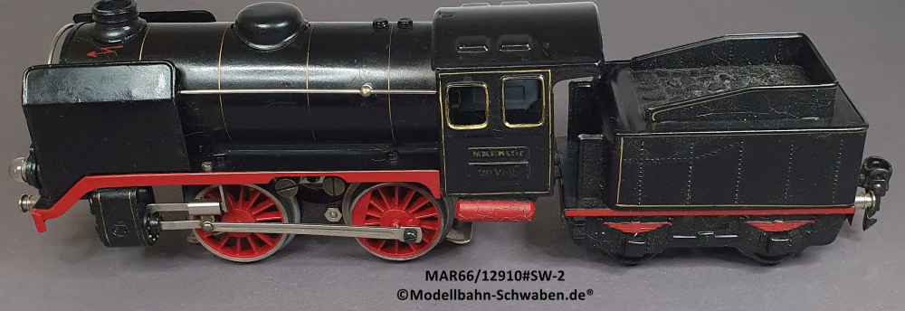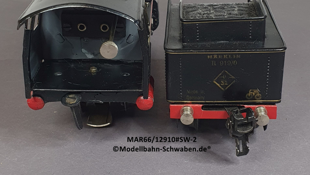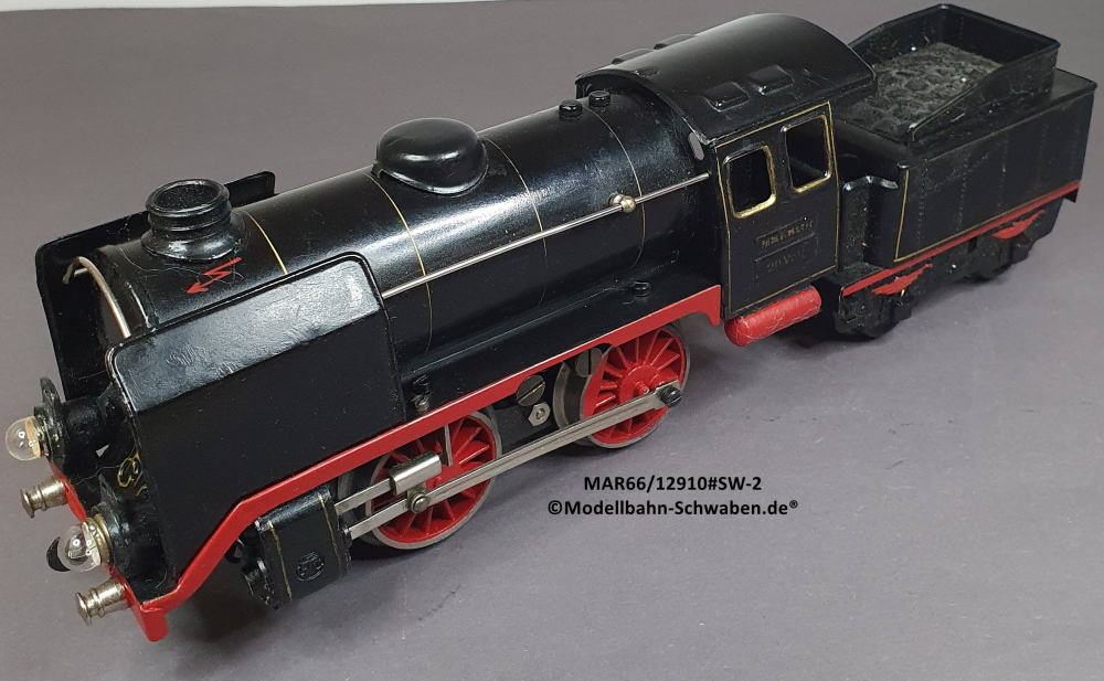 Märklin R66/12910N Spur 0, Dampflok elektrisch 20V, mit Tender R919/0 Baujahr ab 1936, schwarz lackiert, 2 elektrische Stirnlampen, Schaltgestänge für Umschaltung Vor-/Rückwärtsfahrt,