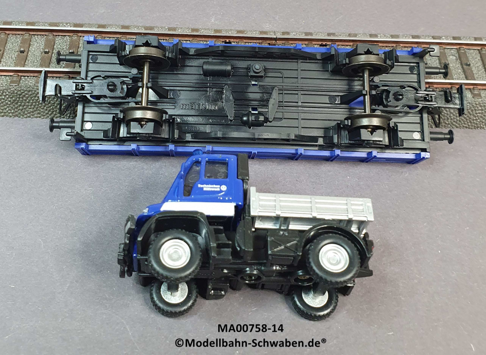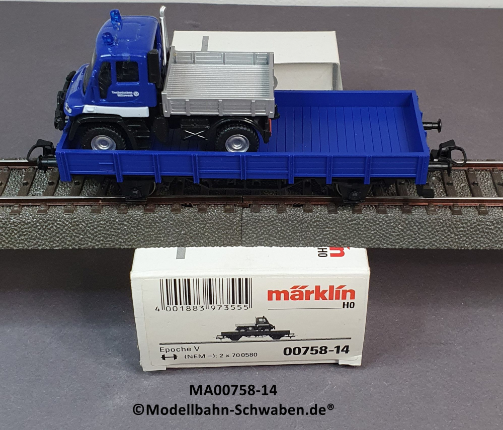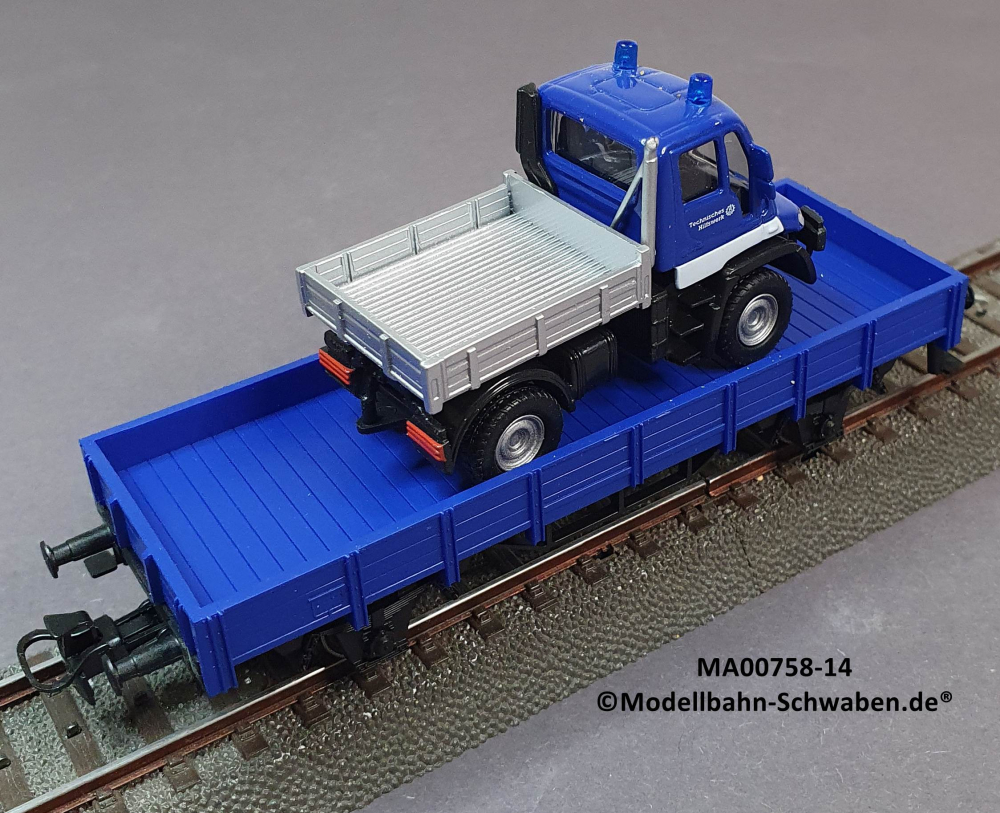 Märklin 00758-14 H0 Flachwagen THW bel. m. MB Unimog, DB, OVP,